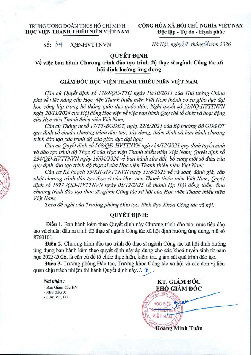 Ngày 22/01/2026, Học viện Thanh thiếu niên Việt Nam ban hành Quyết định số 34/QĐ-HVTTNVN về Chương trình đào tạo trình độ thạc sĩ ngành Công tác xã hội định hướng ứng dụng, mã số 8760101, như sau: