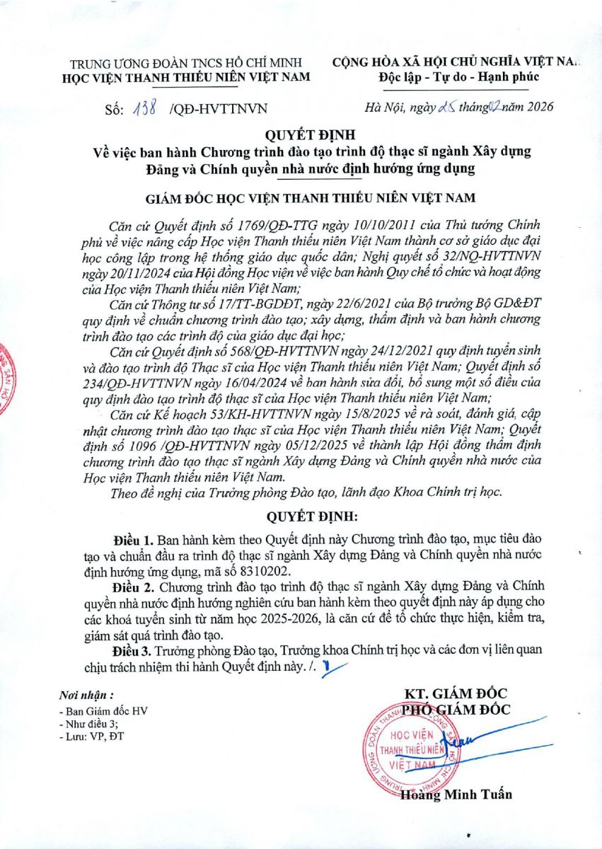Ngày 25/02/2026, Học viện Thanh thiếu niên Việt Nam ban hành Quyết định số 138/QĐ-HVTTNVN về Chương trình đào tạo trình độ thạc sĩ ngành Xây dựng Đảng và Chính quyền nhà nước định hướng ứng dụng, mã số 8310202, như sau: