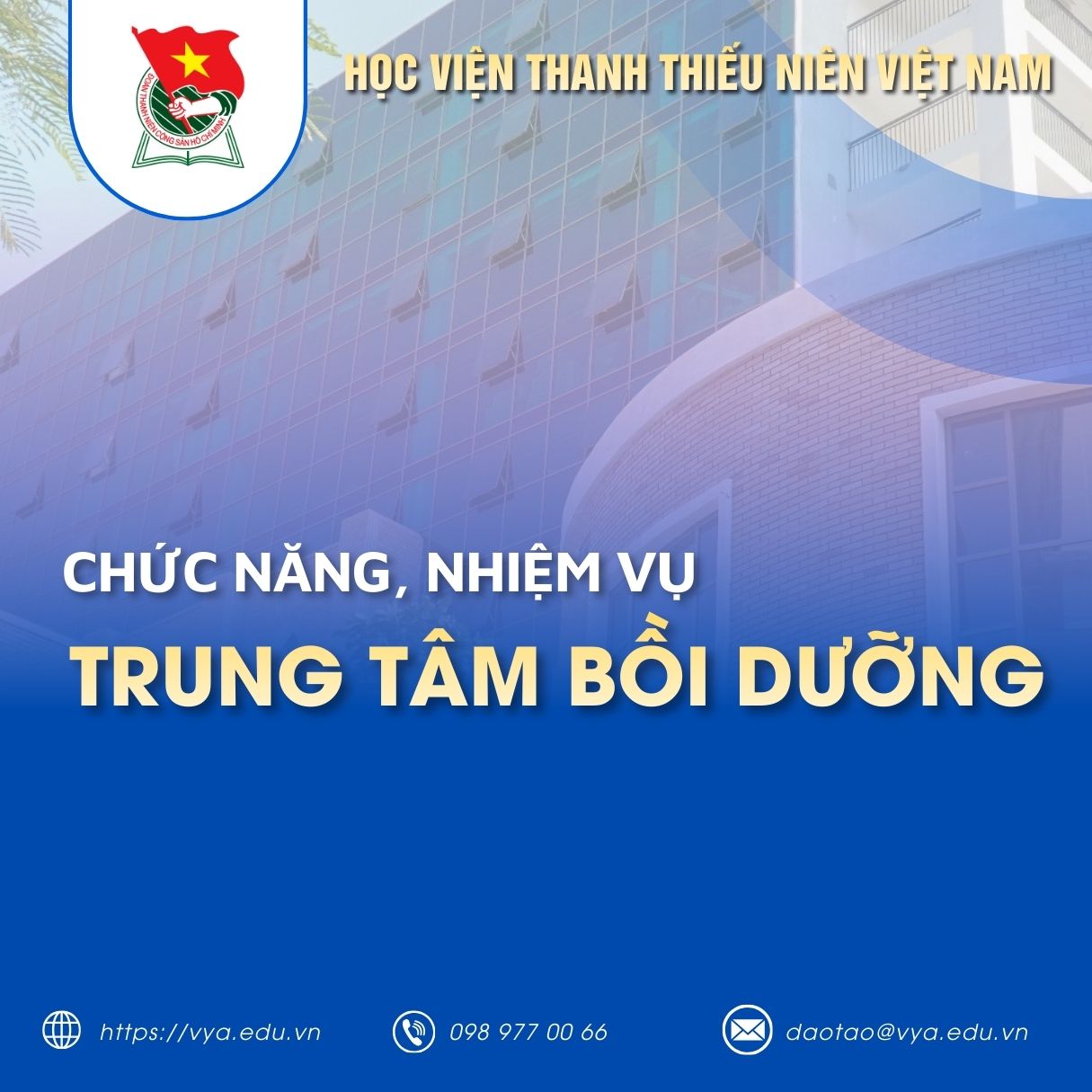 Ngày 24/4/2024, Học viện Thanh thiếu niên Việt Nam ban hành Quyết định số 249/QĐ-HVTTNVN về việc ban hành quy định chức năng, nhiệm vụ của Trung tâm Bồi dưỡng, như sau: