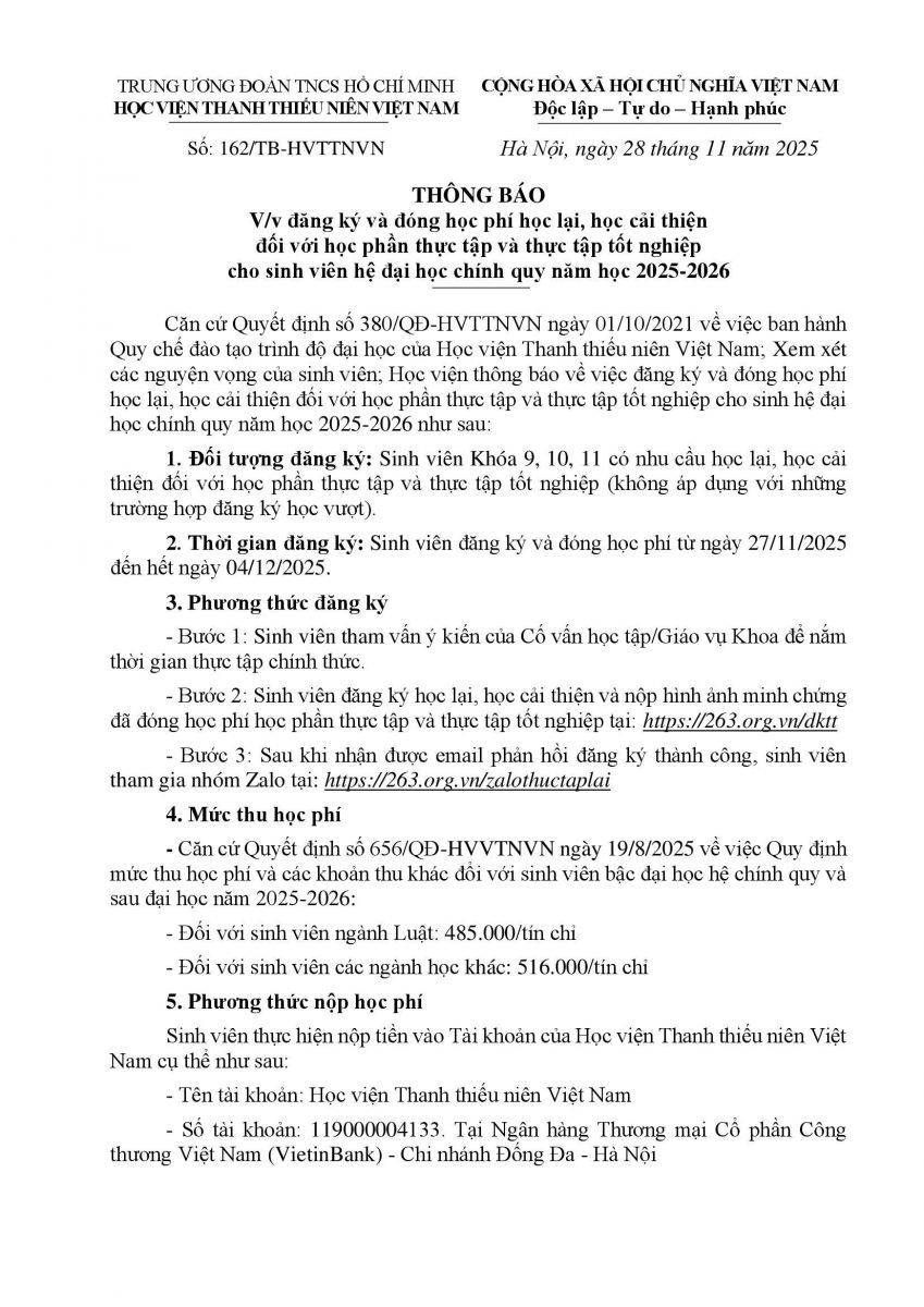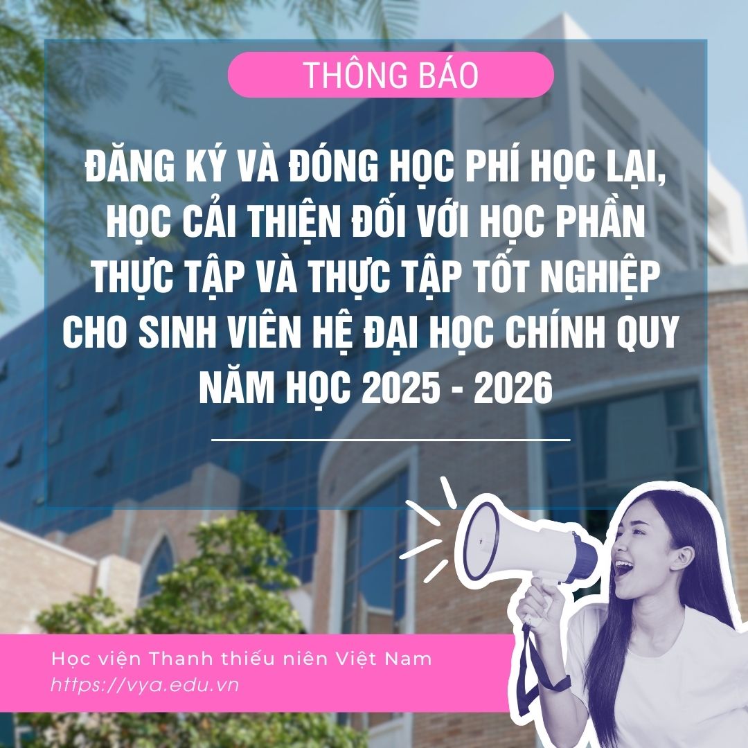 Học viện Thanh thiếu niên Việt Nam thông báo về việc đăng ký và đóng học phí học lại, học cải thiện đối với học phần thực tập và thực tập tốt nghiệp cho sinh viên hệ đại học chính quy năm học 2025 - 2026, như sau: