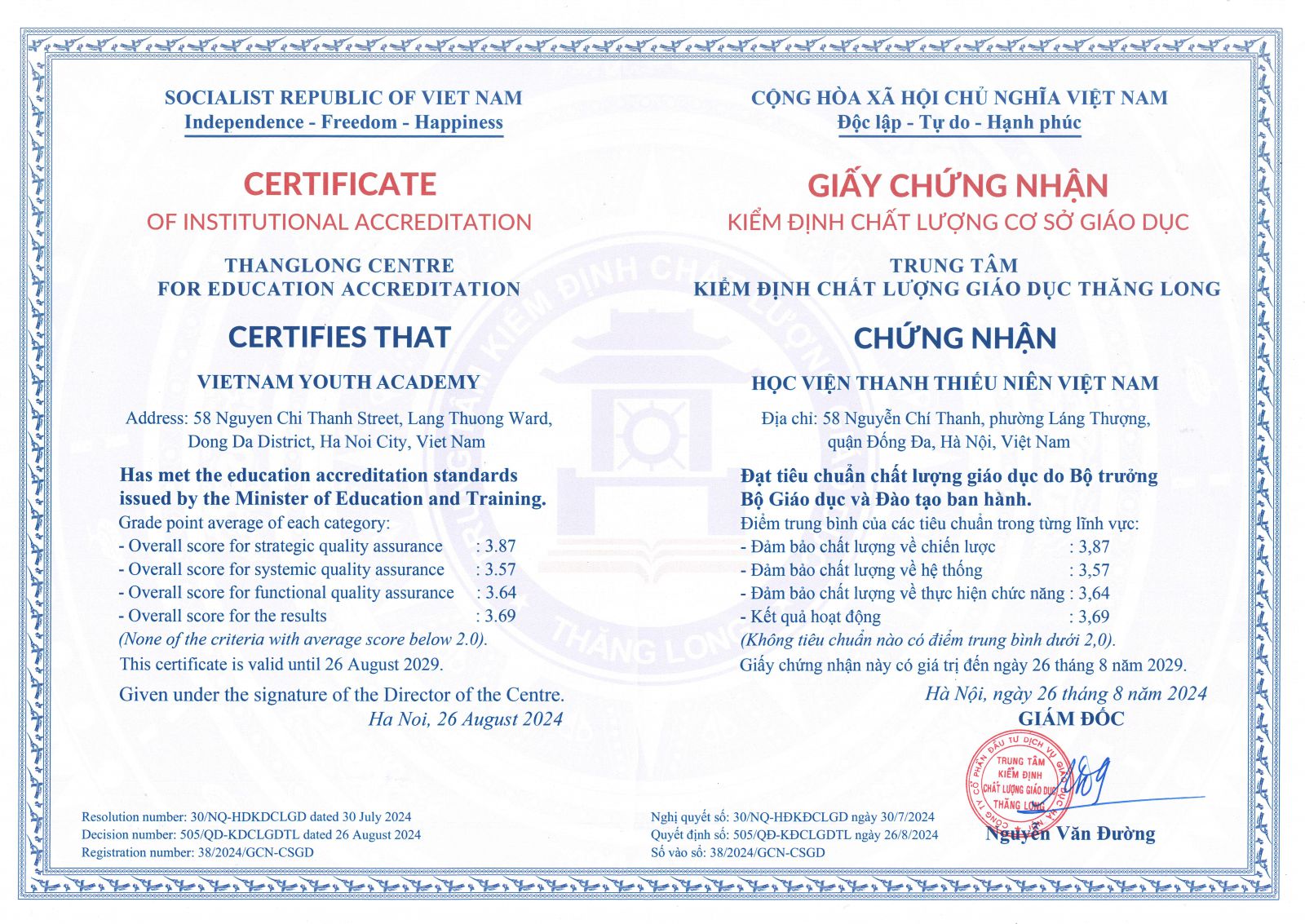 Ngày 26/8/2024, Trung tâm Kiểm định chất lượng giáo dục Thăng Long đã cấp Giấy chứng nhận kiểm định chất lượng cơ sở giáo dục đối với Học viện Thanh thiếu niên Việt Nam với kết quả Đạt tiêu chuẩn chất lượng giáo dục do Bộ trưởng Bộ Giáo dục và Đào tạo ban hành, cụ thể như sau: