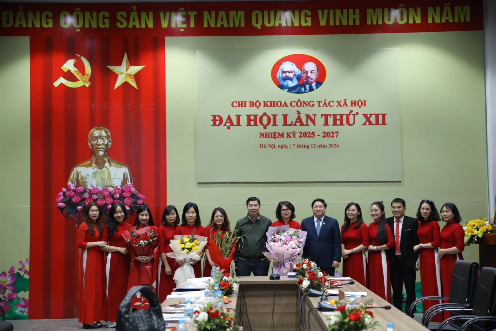 Ban lãnh đạo Học viện chụp ảnh lưu niệm cùng cán bộ, giảng viên, viên chức, người lao động tại Đại hội Chi hộ khoa Công tác xã hội lần thứ XII, nhiệm kỳ 2025 = 2027