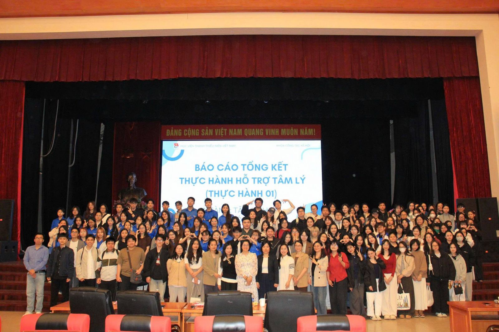 Tập thể cán bộ, giảng viên khoa Công tác xã hội chụp ảnh lưu niệm cùng sinh viên tại buổi Báo cáo tổng kết thực hành hỗ trợ tâm lý (thực hành 01)