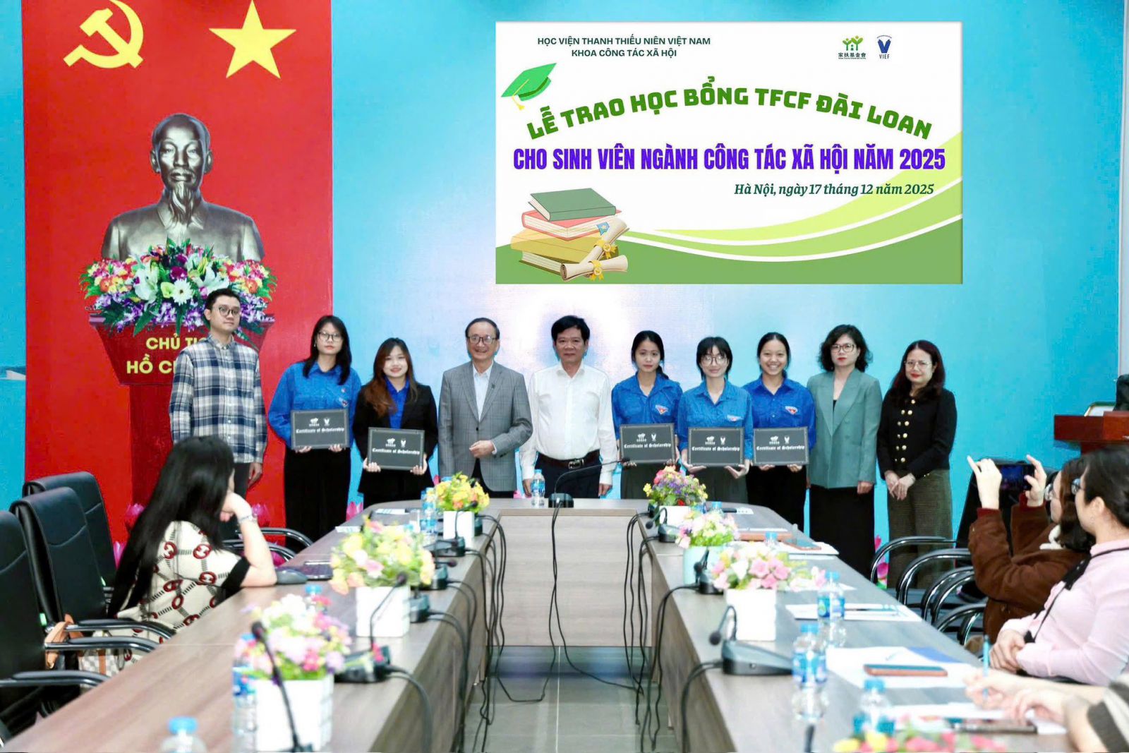 Ban lãnh đạo Học viện chụp ảnh kỷ niệm cùng giảng viên, sinh viên khoa Công tác xã hội tại Chương trình thử nghiệm bộ công cụ giáo dục nâng cao nhận thức về kỹ thuật số cho thanh niên