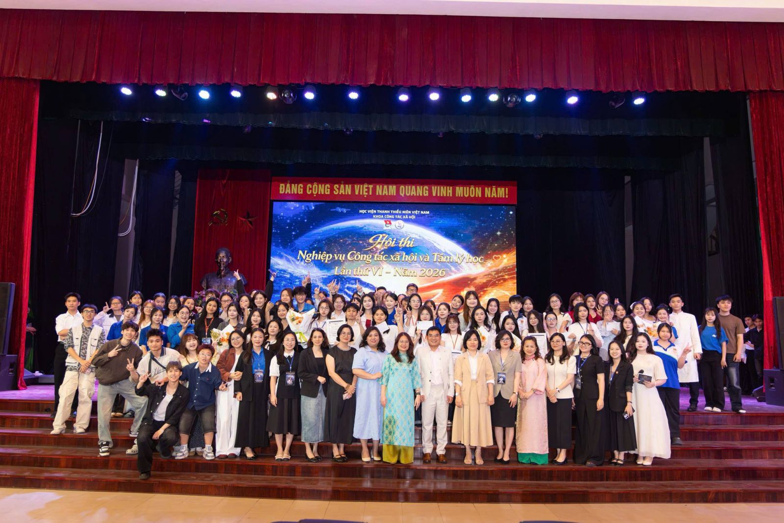 Tập thể cán bộ, giảng viên khoa Công tác xã hội chụp ảnh lưu niệm cùng sinh viên tại Hội thi nghiệp vụ Công tác xã hội và Tâm lý học lần thứ VI. năm 2026