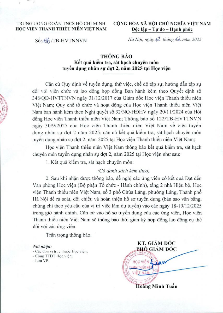 Thông báo của Học viện Thanh thiếu niên Việt Nam về kết quả kiểm tra, sát hạch chuyên môn tuyển dụng nhân sự đợt 2, năm 2025 tại Học viện, như sau: