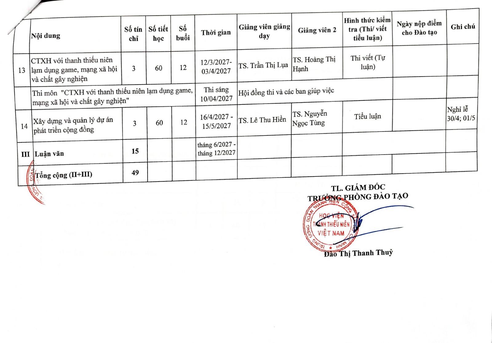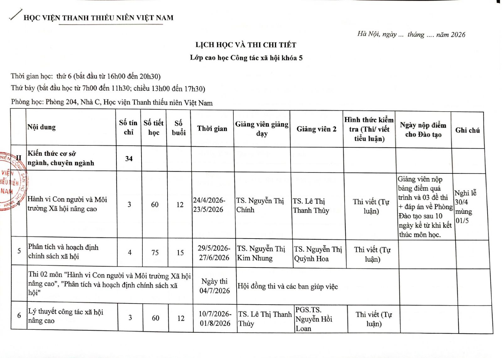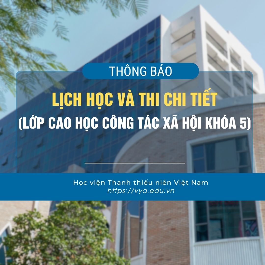 Học viện Thanh thiếu niên Việt Nam thông báo Lịch học và thi chi tiết lớp cao học Công tác xã hội khóa 5, như sau: