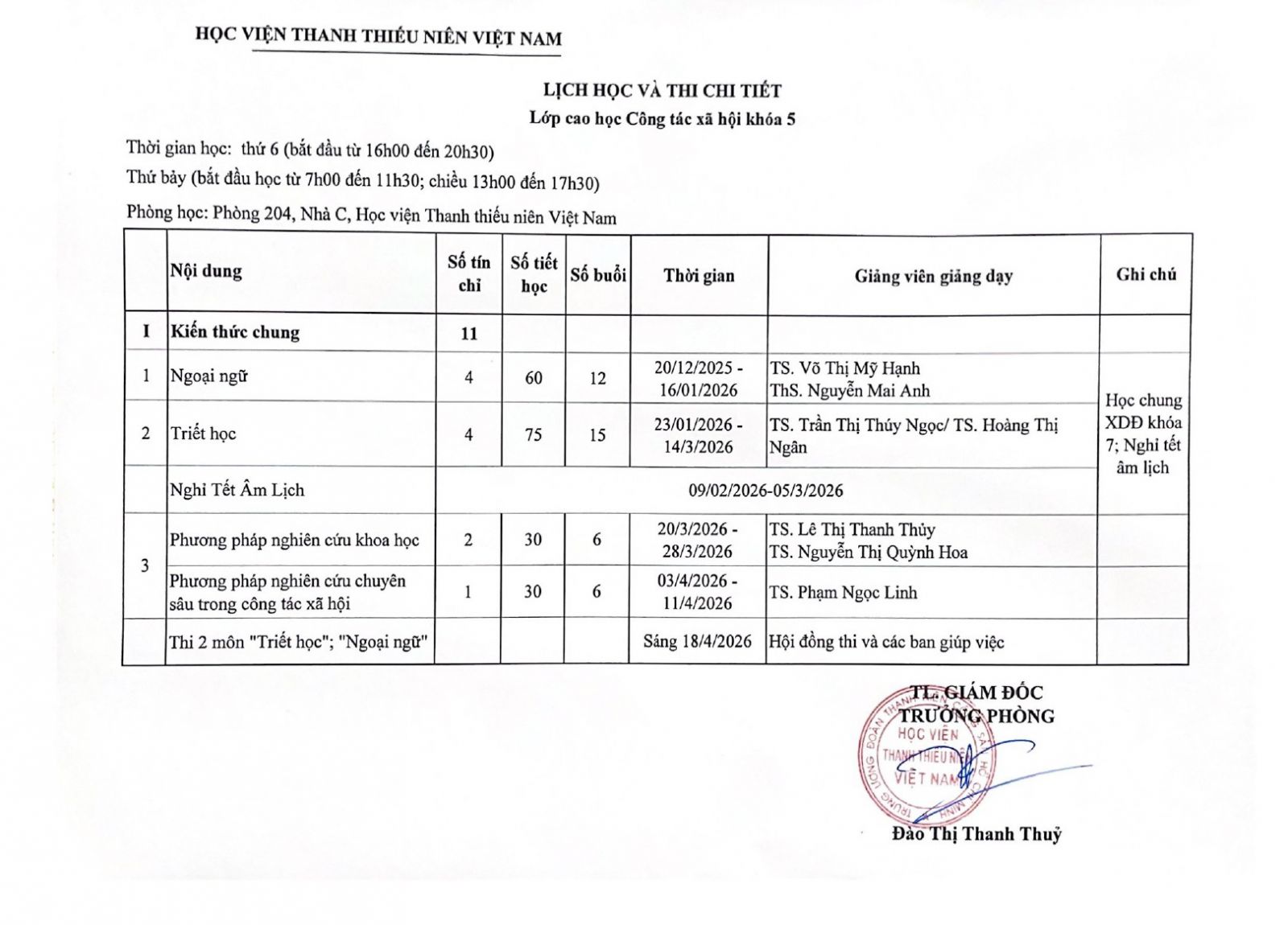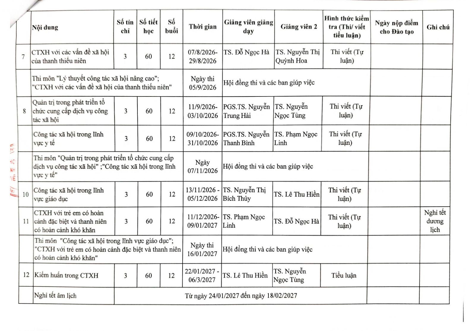 Lịch học và thi chi tiết lớp cao học Công tác xã hội khóa 5