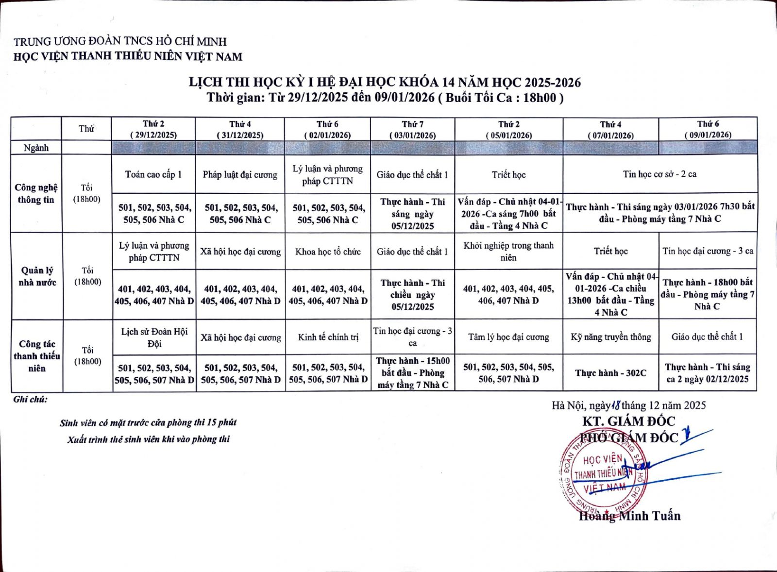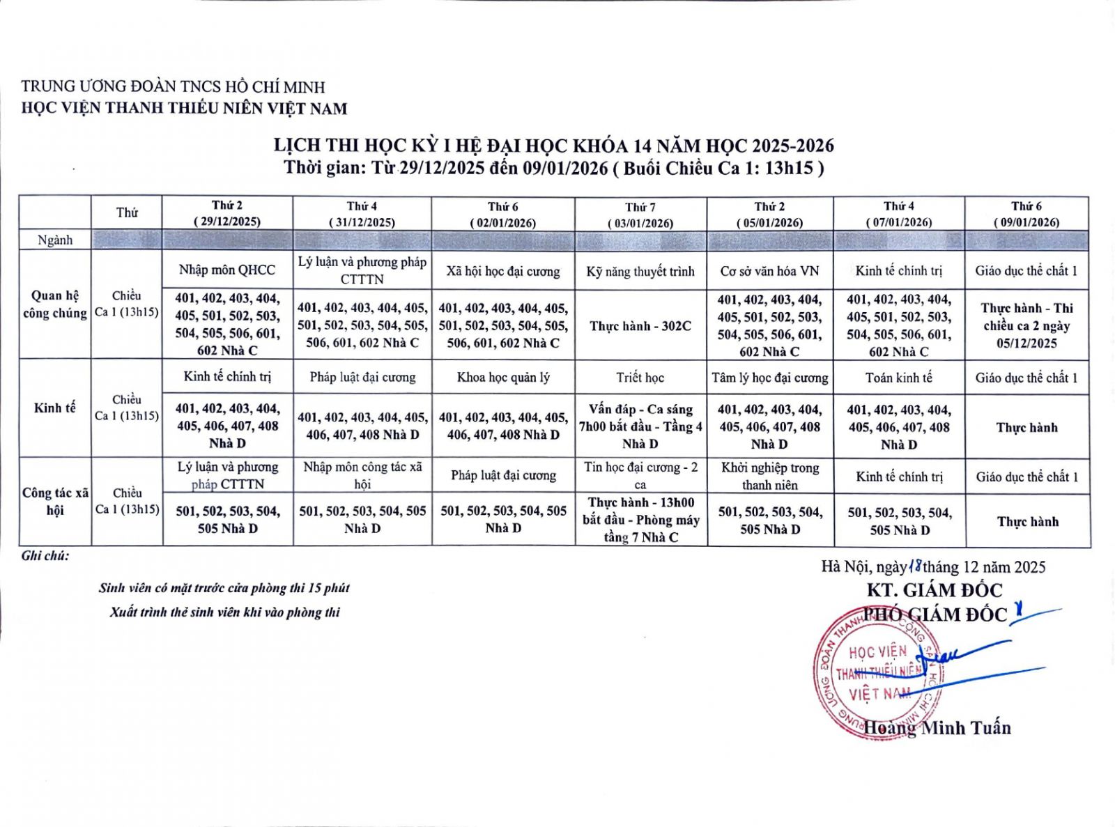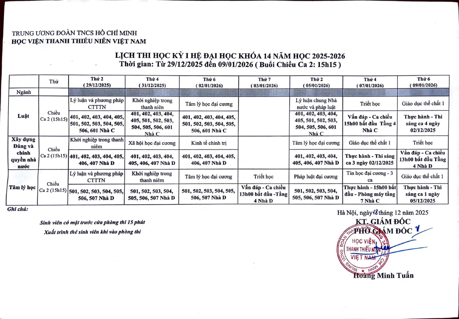 Học viện Thanh thiếu niên Việt Nam thông báo lịch thi Học kỳ 1 hệ đại học khóa 14 năm học 2025 - 2026, cụ thể như sau: