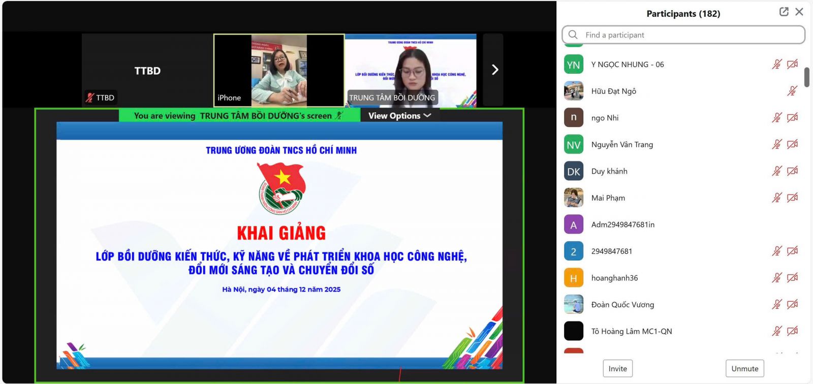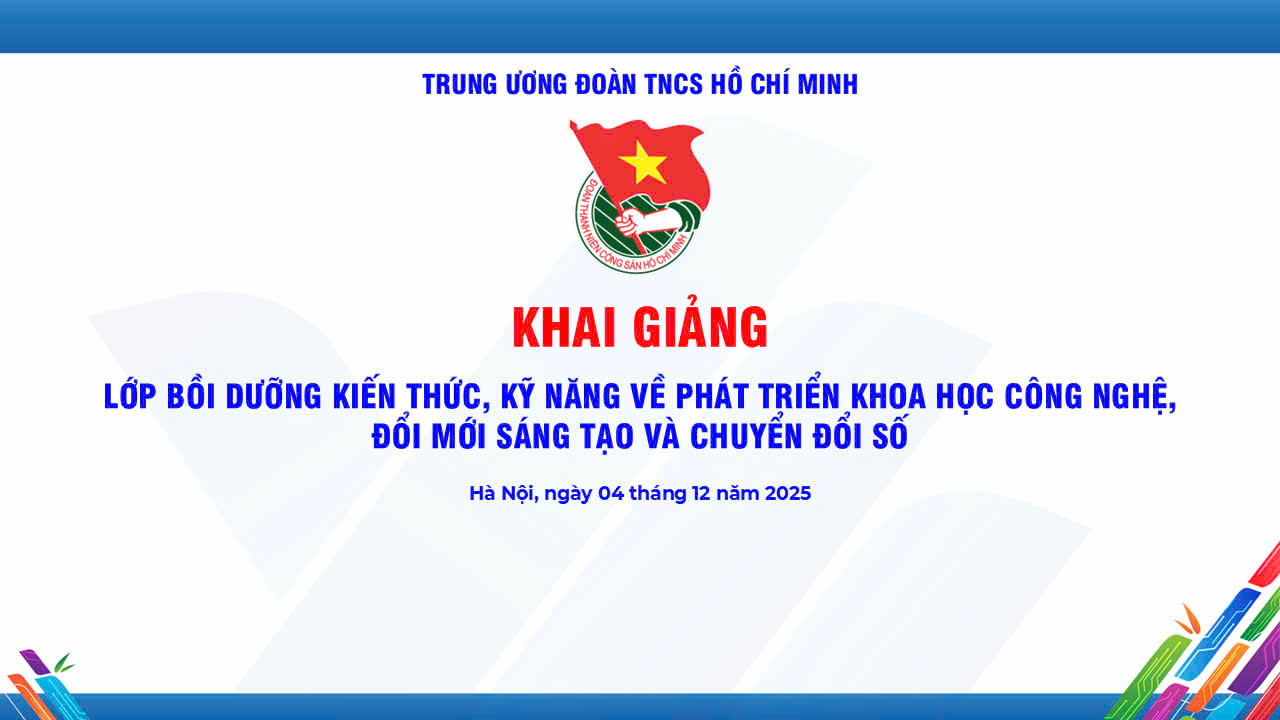 Sáng ngày 04/12/2025 tại Hà Nội, Trung ương Đoàn TNCS Hồ Chí Minh tổ chức khai giảng Lớp bồi dưỡng kiến thức, kỹ năng về phát triển khoa học công nghệ, đổi mới sáng tạo và chuyển đổi số năm 2025 theo hình thức trực tuyến.