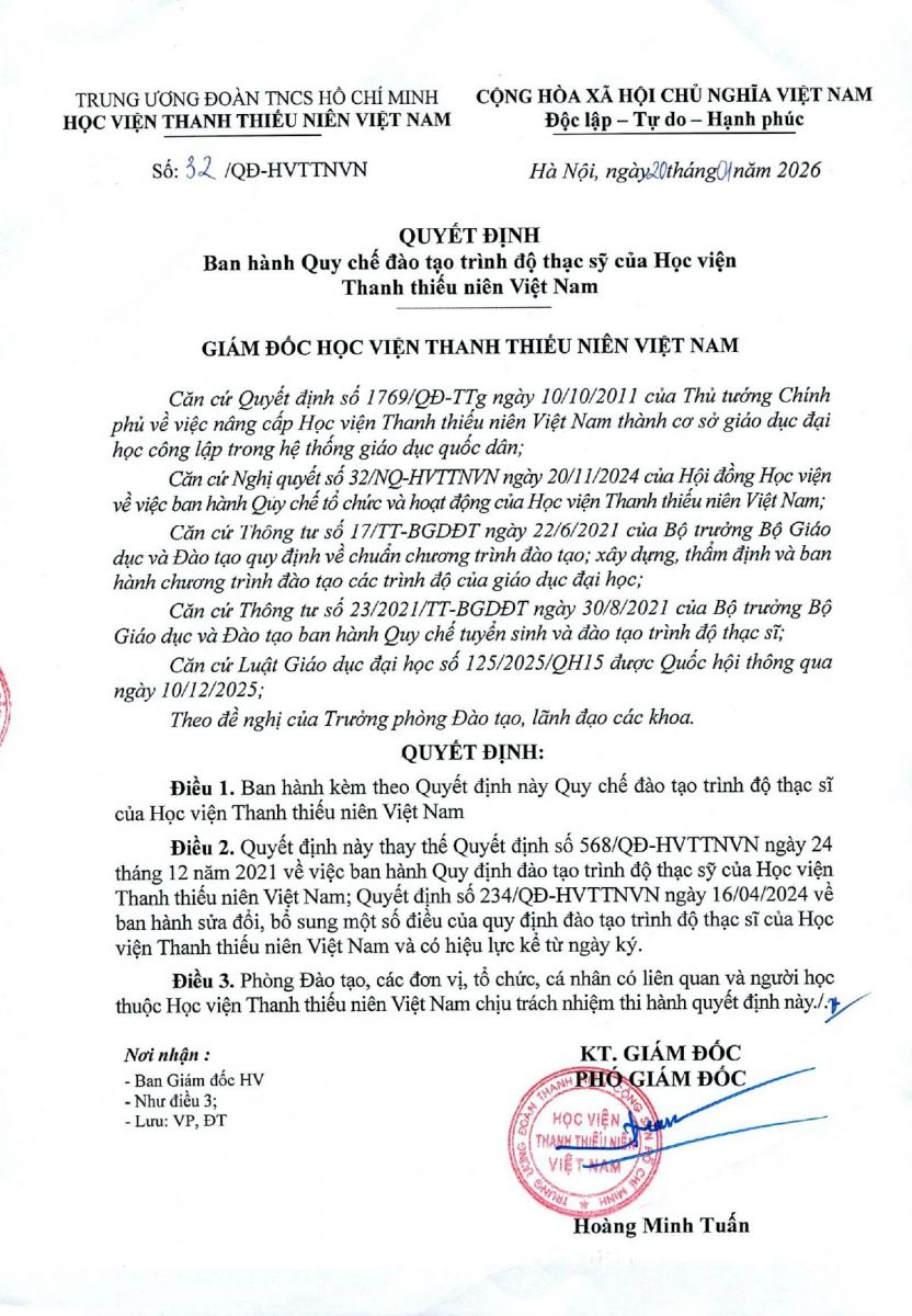 Ngày 20/01/2026, Học viện Thanh thiếu niên Việt Nam ban hành Quyết định số 32/QĐ-HVTTNVN về Quy chế đào tạo trình độ thạc sỹ của Học viện Thanh thiếu niên Việt Nam, như sau: