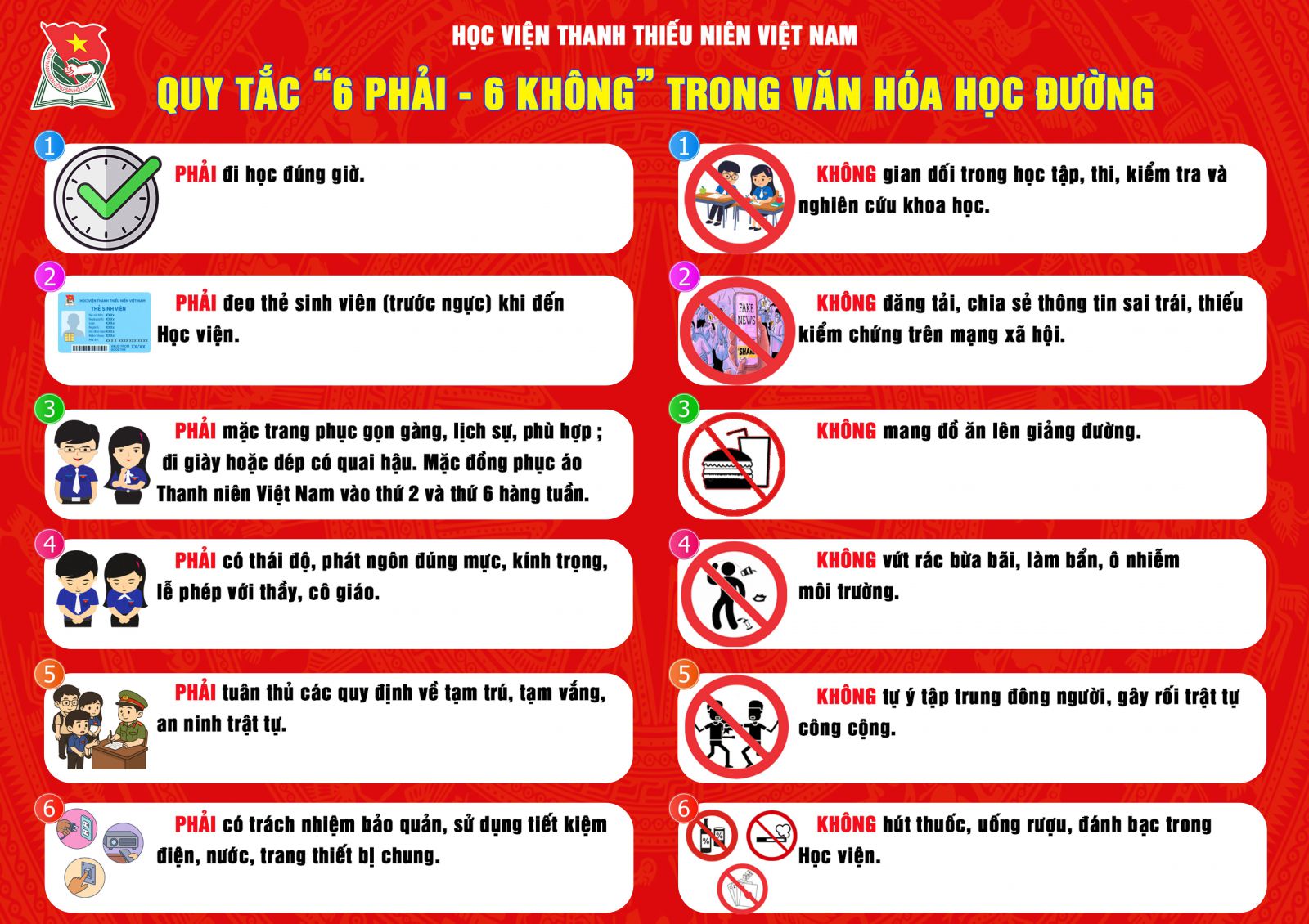 Học viện Thanh thiếu niên Việt Nam thông báo tới toàn thể các bạn học viên, sinh viên bộ Quy tắc "6 phải - 6 không" trong văn hóa học đường, như sau: