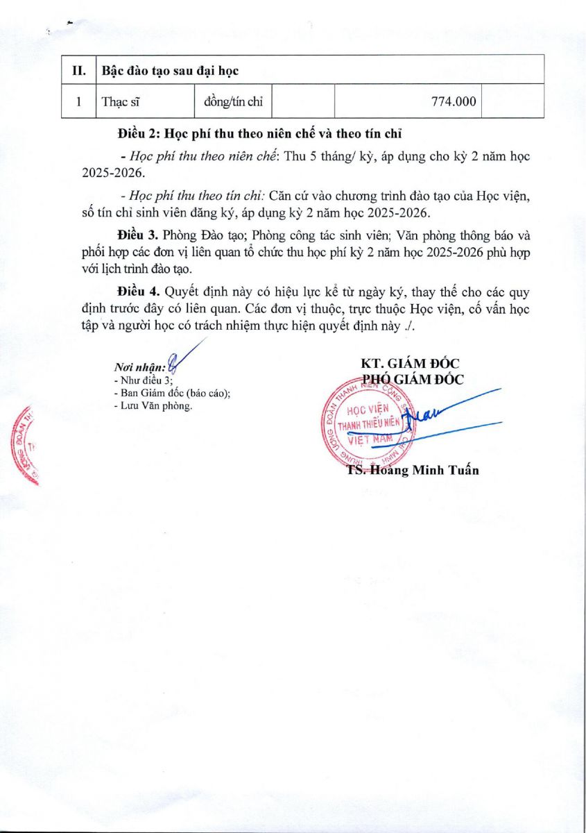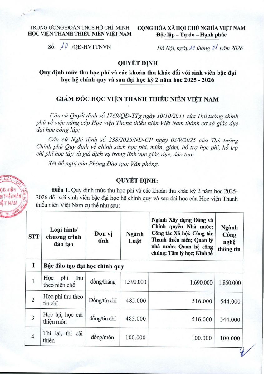 Học viện Thanh thiếu niên Việt Nam Quyết định quy định mức thu học phí và các khoàn thu khác đối với sinh viên bậc đại học hệ chính quy và sau đại học kỳ 2 năm học 2025 - 2026, như sau: