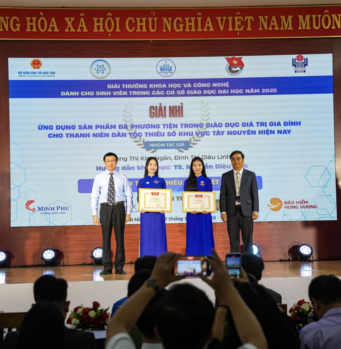 Nhóm tác giả Trương Thị Kim Ngân (K11CC7) và Đinh Thị Diệu Linh (K11TN) nhận giải thưởng cho kết quả nghiên cứu khoa học với đề tài “Ứng dụng sản phẩm đa phương tiện trong giáo dục giá trị gia đình cho thanh niên dân tộc thiểu số khu vực Tây Nguyên hiện nay"