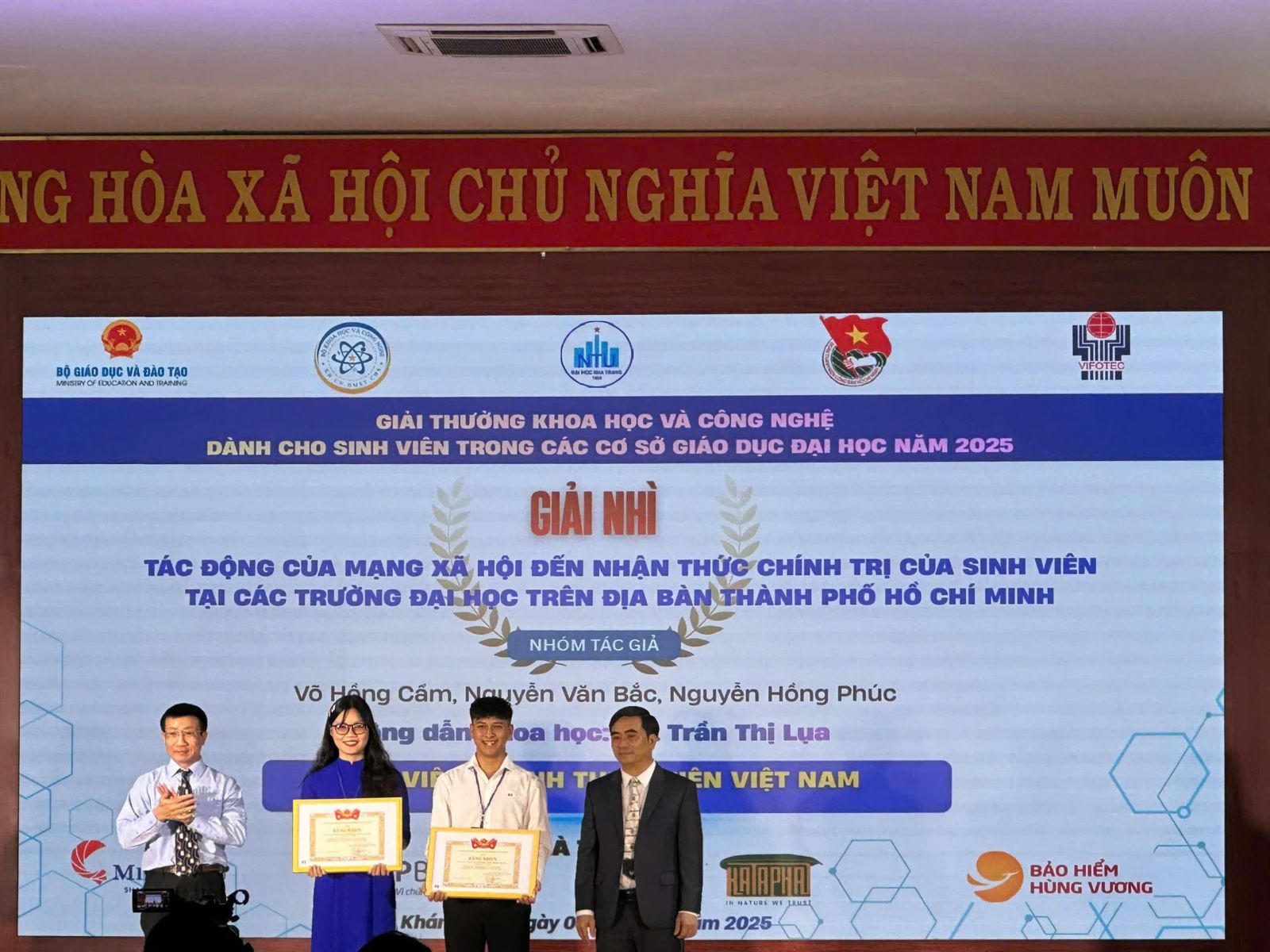 Nhóm tác giả nghiên cứu khoa học với đề tài “Tác động của mạng xã hội đến nhận thức chính trị của sinh viên các trường đại học trên địa bàn thành phố Hồ Chí Minh” đoạt giải Nhì giải thưởng Khoa học công nghệ.