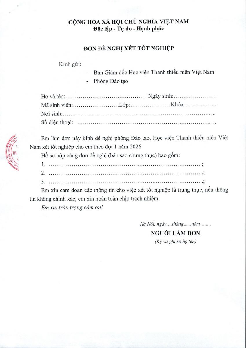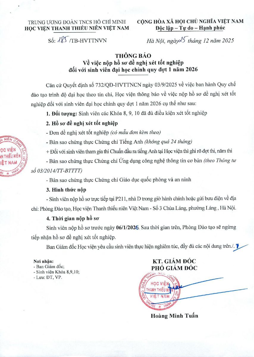 Học viện Thanh thiếu niên Việt Nam thông báo về việc nộp hồ sơ đề nghị xét tốt nghiệp đối với sinh viên đại học chính quy đợt 1, năm 2026, cụ thể như sau: