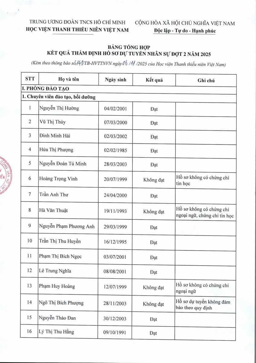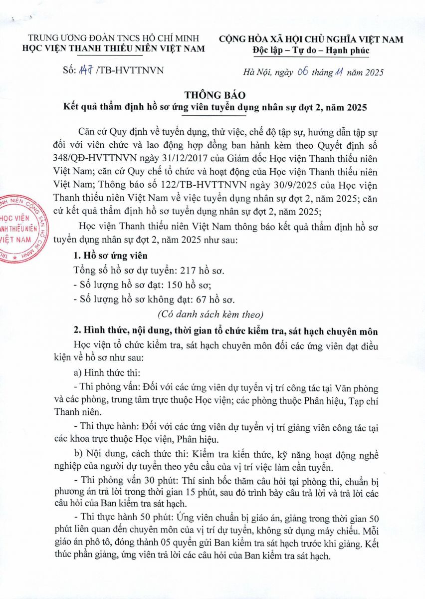 Căn cứ kết quả thẩm định hồ sơ tuyển dụng nhân sự đợt 2, năm 2025 Học viện Thanh thiếu niên Việt Nam thông báo như sau: