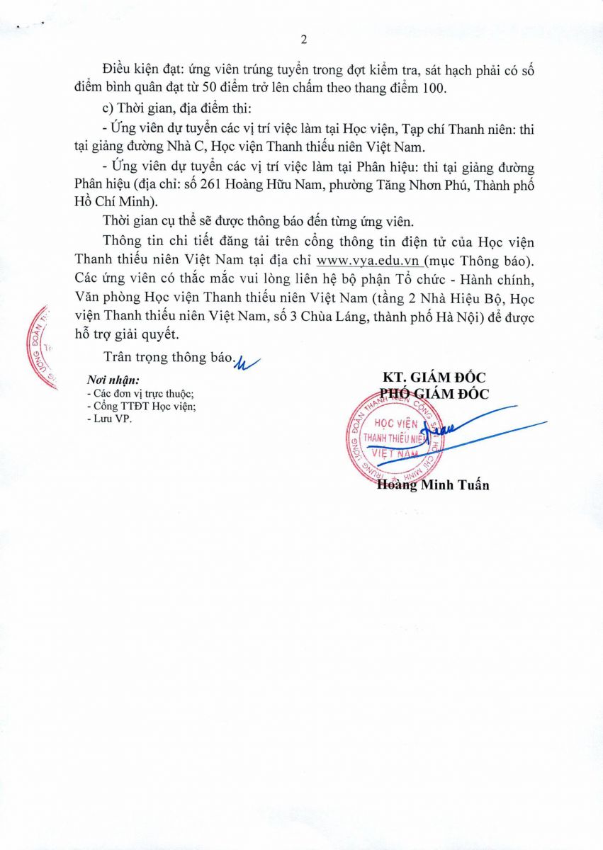 - Các ứng viên có thắc mắc vui lòng liên hệ bộ phận Tổ chức - Hành chính, Văn phòng Học viện Thanh thiếu niên Việt Nam, tầng 2 Nhà Hiệu bộ, số 3 phố Chùa Láng, phường Láng, TP. Hà Nội.