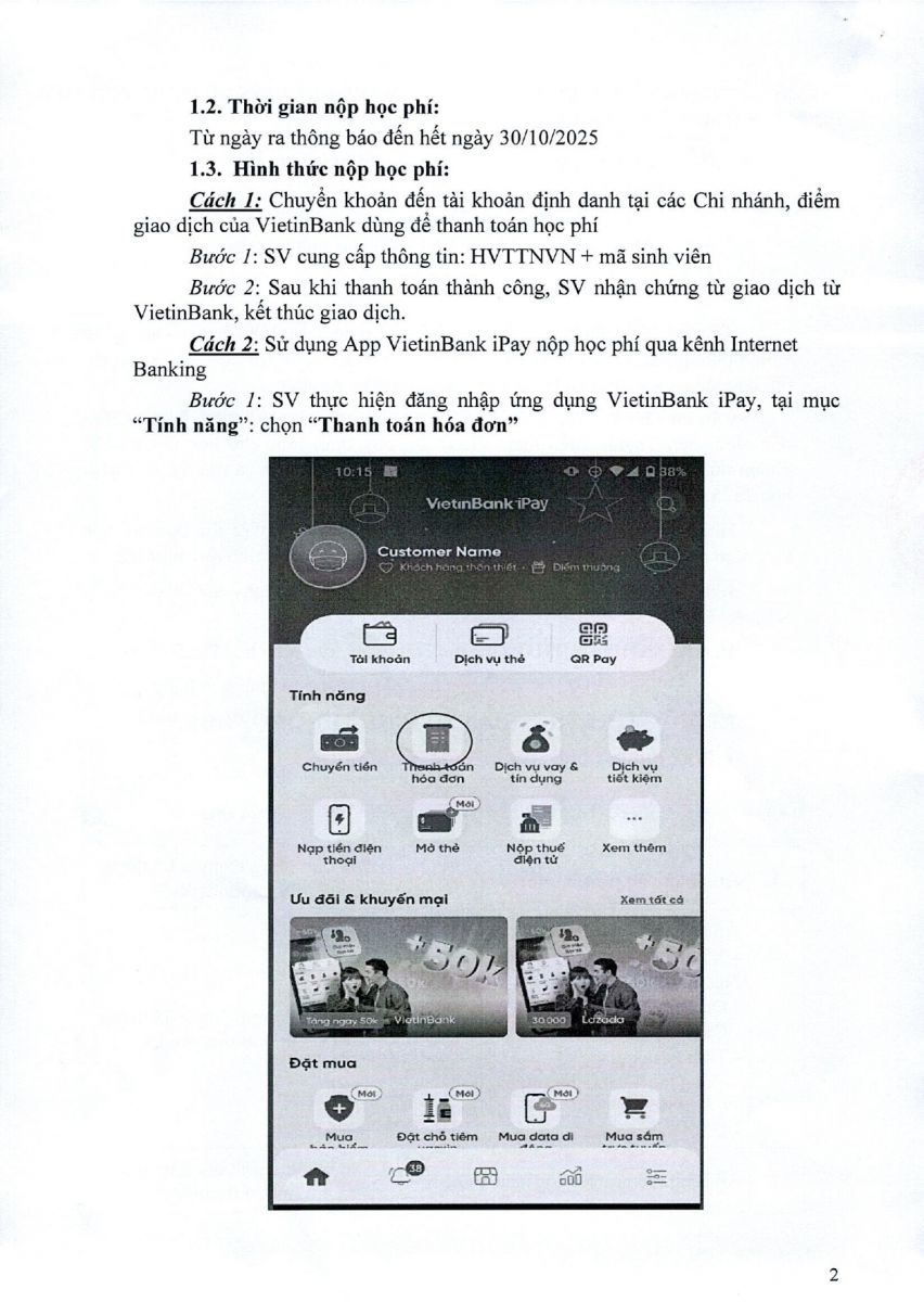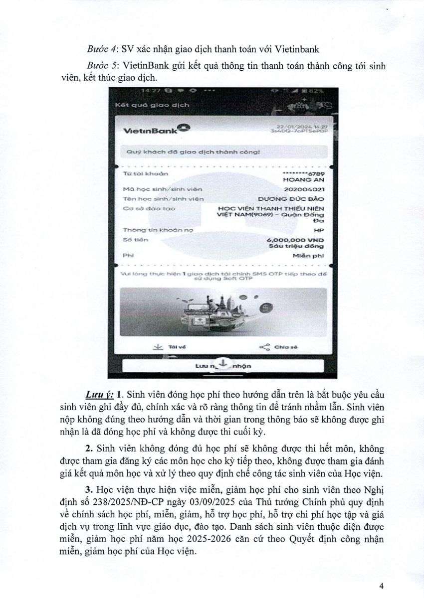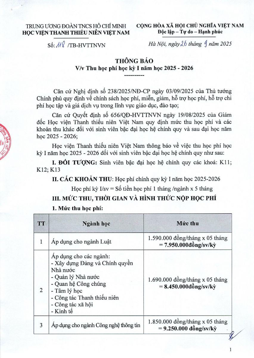 Thông báo thu học phí của sinh viên Khóa 11, 12, 13 - Học kỳ I năm học 2025 - 2026