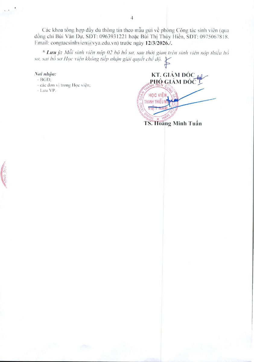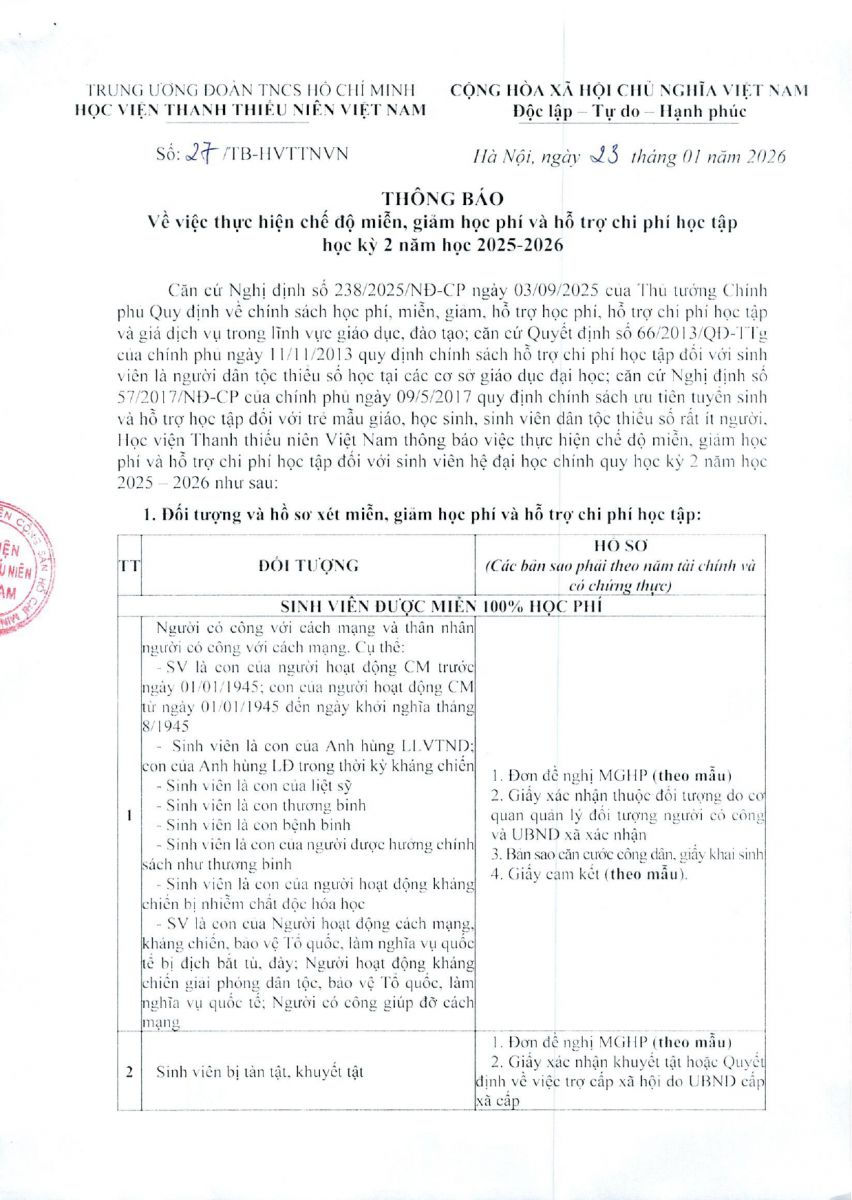 Học viện Thanh thiếu niên Việt Nam thông báo việc thực hiện chế độ miễn, giảm học phí và hỗ trợ chi phí học tập đối với sinh viên hệ đại học chính quy học kỳ 2 năm học 2025 - 2026 như sau: