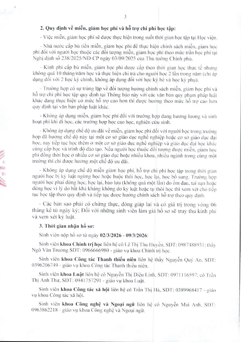 Thông báo về việc thực hiện chế độ miễn, giảm học phí và hỗ trợ chi phí học tập học kỳ 2 năm học 2025 - 2026