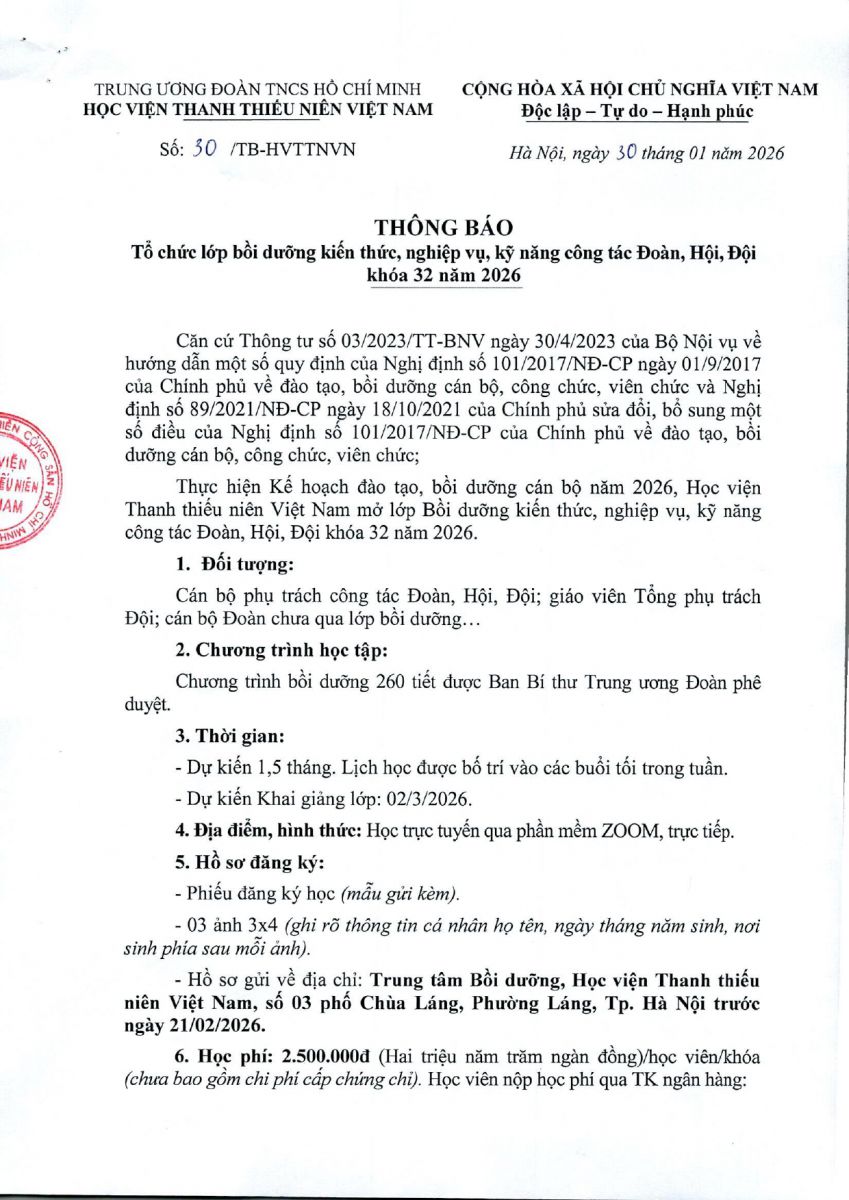 Thực hiện Kế hoạch đào tạo, bồi dưỡng cán bộ năm 2026, Học viện Thanh thiếu niên Việt Nam mở lớp Bồi dưỡng kiến thức, nghiệp vụ, kỹ năng công tác Đoàn, Hội, Đội khóa 32 năm 2026, như sau: