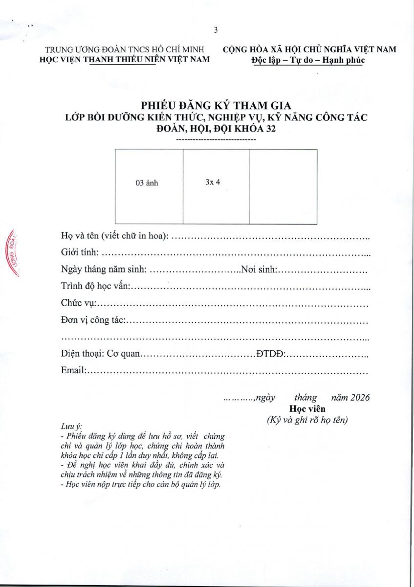 - Học viên tải mẫu Phiếu đăng ký tham gia Lớp bồi dưỡng kiến thức, nghiệp vụ, kỹ năng công tác Đoàn, Hội, Đội khóa 32 TẠI ĐÂY