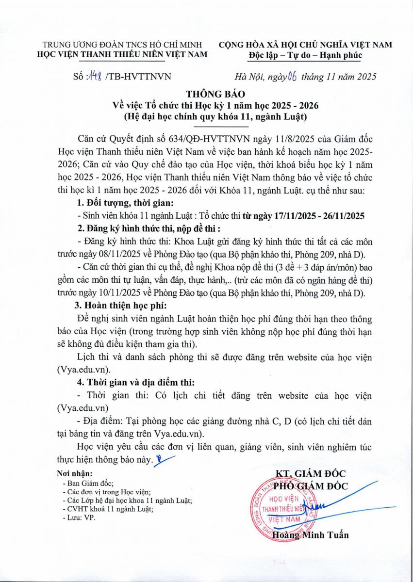 Căn cứ vào Quy chế đào tạo của Học viện, thời khóa biểu học kỳ 1 năm học 2025 - 2026, Học viện Thanh thiếu niên Việt Nam thông báo về việc tổ chức thi học kỳ 1 năm học 2025 - 2026 đối với Khóa 11, ngành Luật, cụ thể như sau: