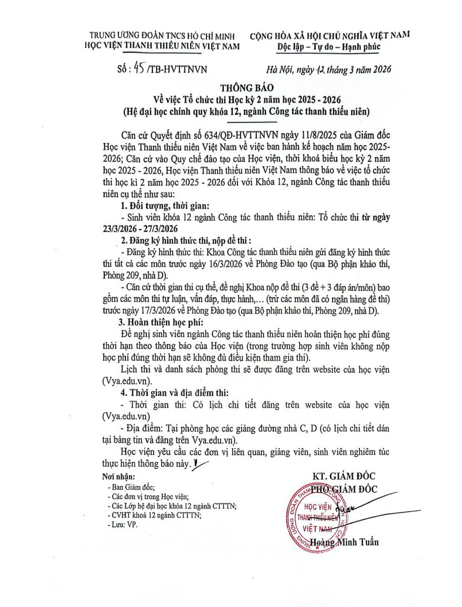 Thông báo về việc Tổ chức thi Học kỳ 2 năm học 2025 - 2026 (Hệ đại học chính quy khóa 12, ngành Công tác Thanh thiếu niên)