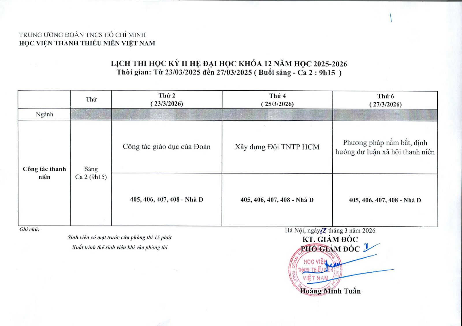 *LƯU Ý: Đối tượng: Sinh viên khóa 12 ngành Công tác Thanh thiếu niên: Tổ chức thi từ ngày 23/3/2026 - 27/3/2026.