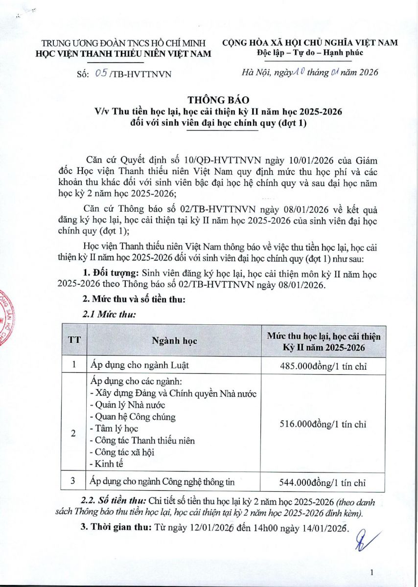 Học viện Thanh thiếu niên Việt Nam thông báo về việc thu tiền học lại, học cải thiện môn kỳ II năm học 2025 - 2026 đối với sinh viên đại học chính quy (đợt 1) theo Thông báo số 02/TB-HVTTNVN ngày 08/1/2026 như sau: