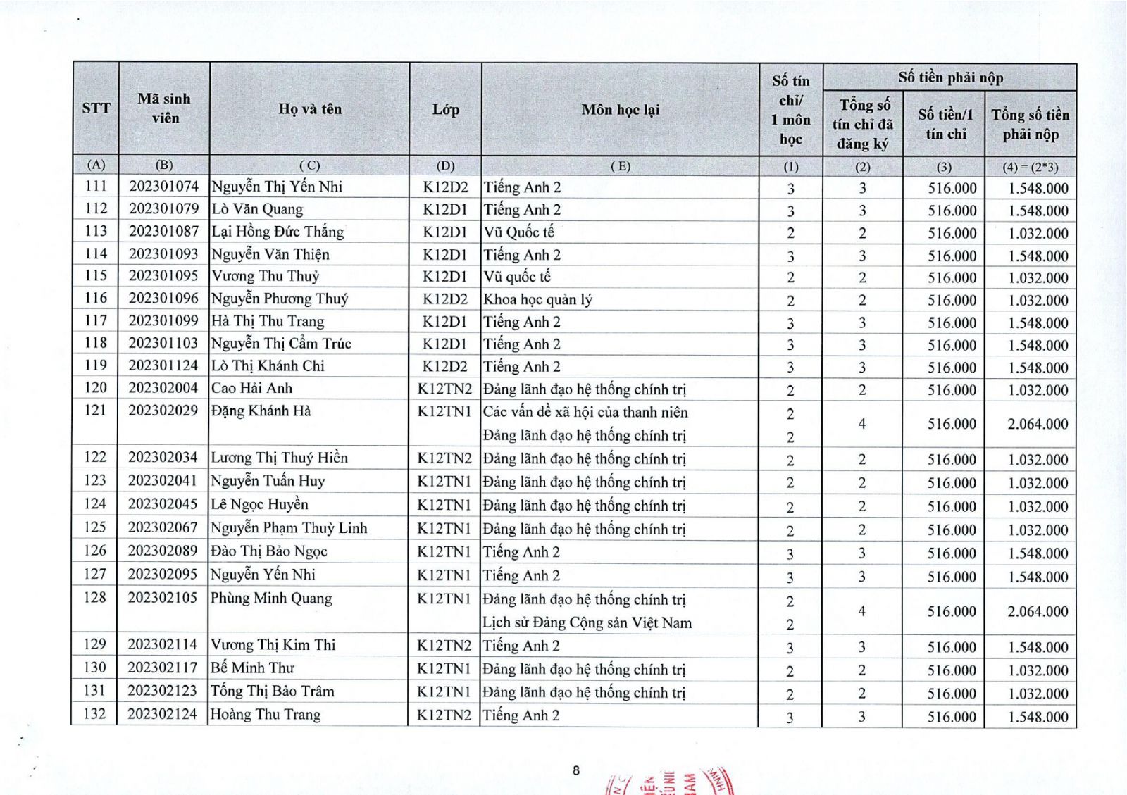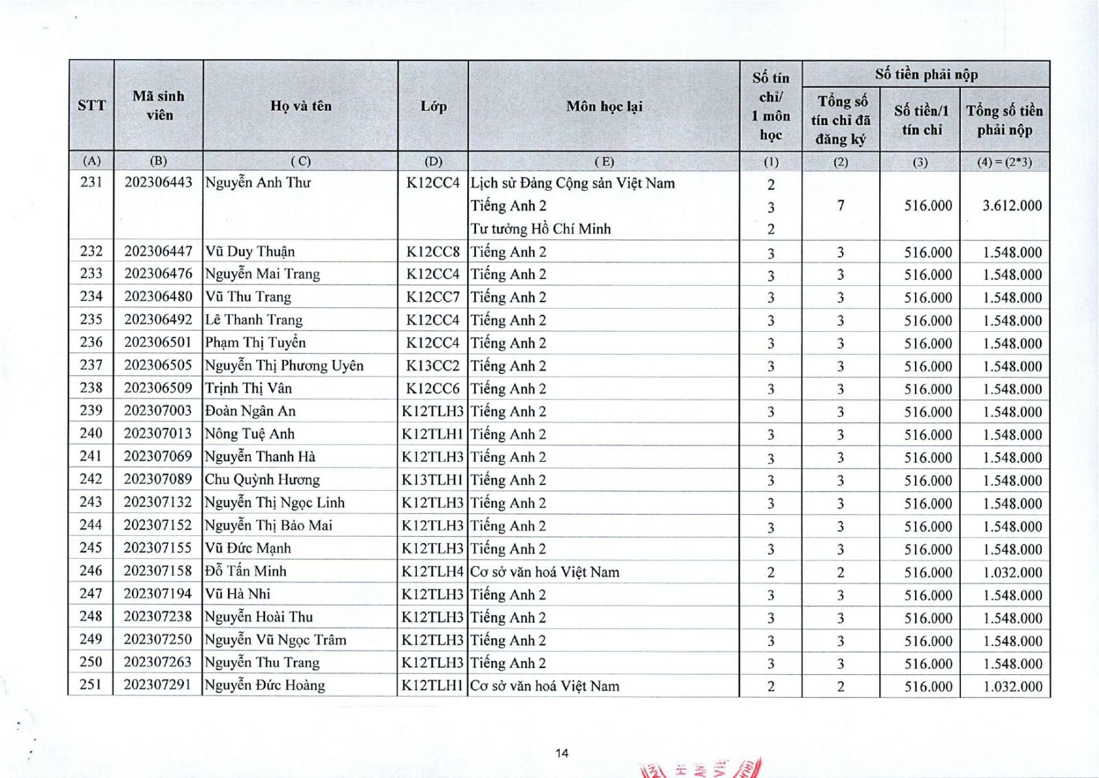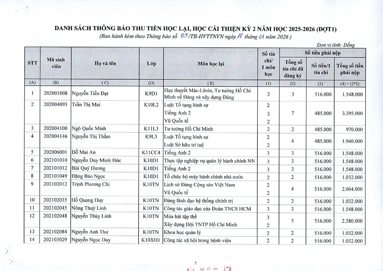 Thông báo về việc thu tiền học lại, học cải thiện kỳ II năm học 2025 - 2026 đối với sinh viên đại học chính quy (đợt 1)
