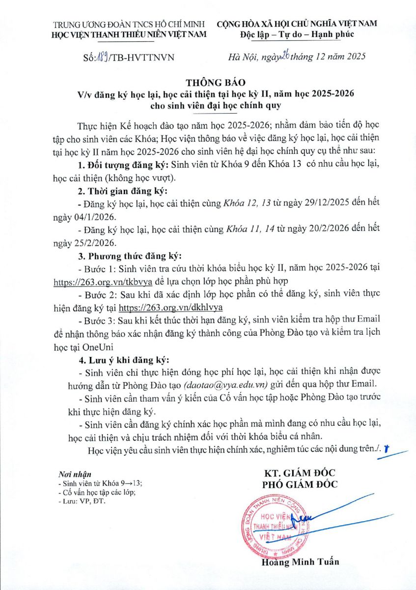 Thực hiện Kế hoạch đào tạo năm học 2025 - 2026, nhằm đảm bảo tiến độ học tập cho sinh viên các Khóa, Học viện Thanh thiếu niên Việt Nam thông báo về việc đăng ký học lại, học cải thiện tại học kỳ II, năm học 2025 - 2026 cho sinh viên đại học chính quy, cụ thể như sau:
