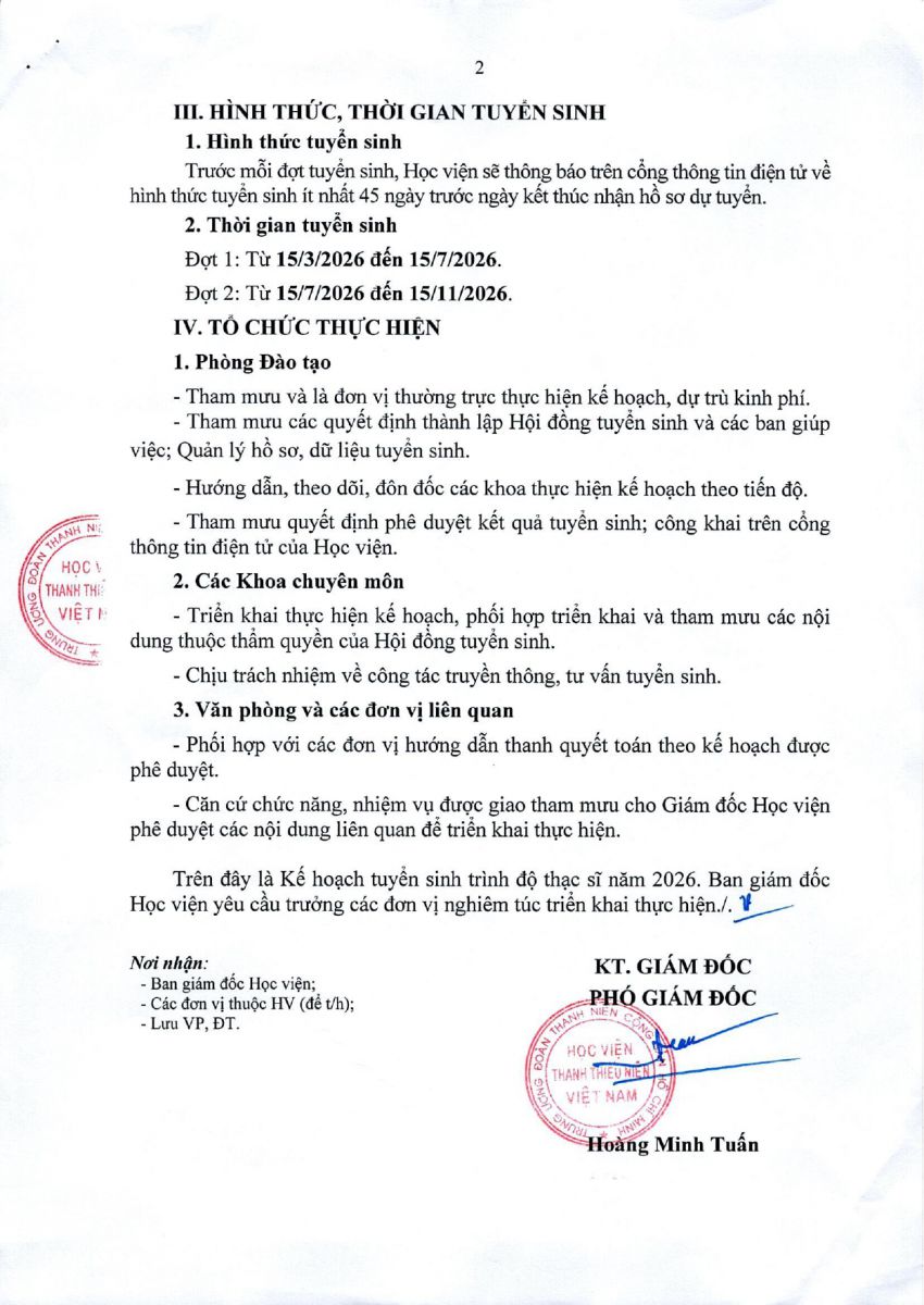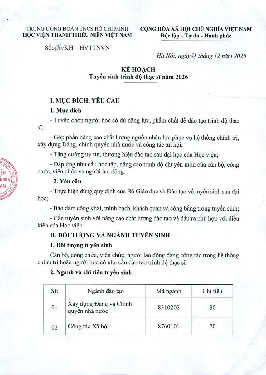 Học viện Thanh thiếu niên Việt Nam bạn hành Kế hoạch Tuyển sinh trình độ Thạc sĩ năm 2026 như sau: